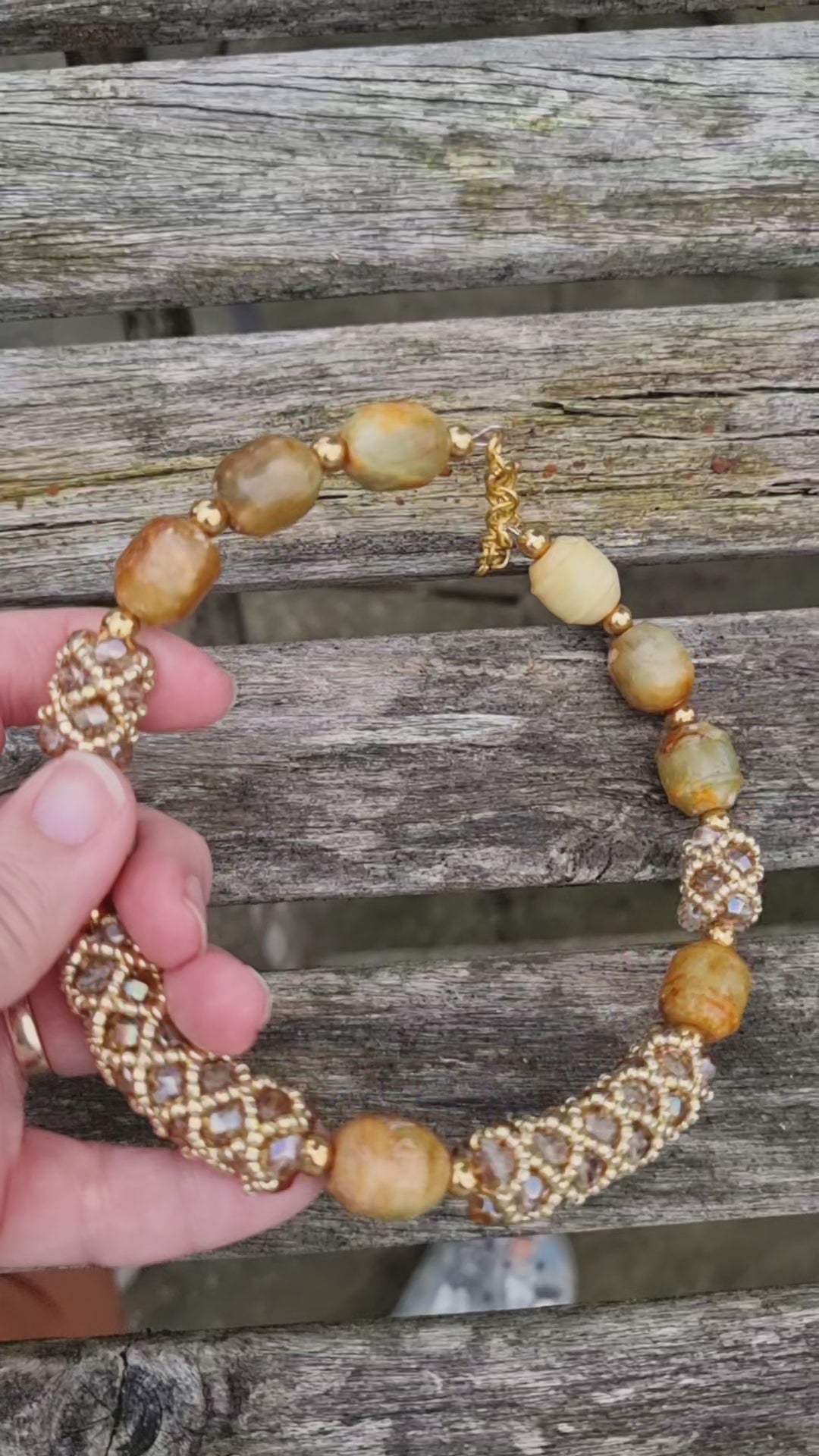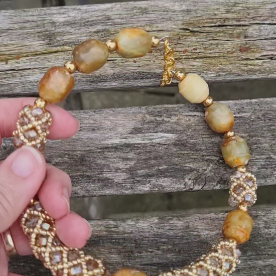 At its heart sit substantial faceted old jade beads in the most gorgeous spectrum of warm honey, amber, and earthy green — each one unique, each one glowing with the kind of depth that only a natural stone can offer. Between them, intricate bead stations of champagne crystal, gold seed beads, and gold plated spacers create an almost architectural effect — structured, ornate, and impossibly tactile. The whole piece is strung on memory wire so it holds its perfect circular shape beautifully, sitting as a choker at a flattering 16 to 17 inches, finished with a gold plated chain and lobster clasp.